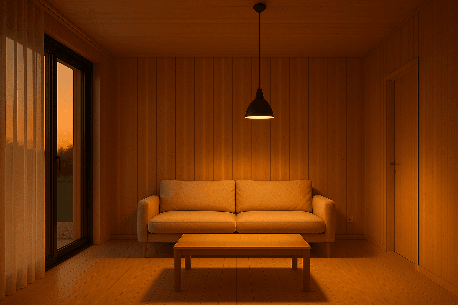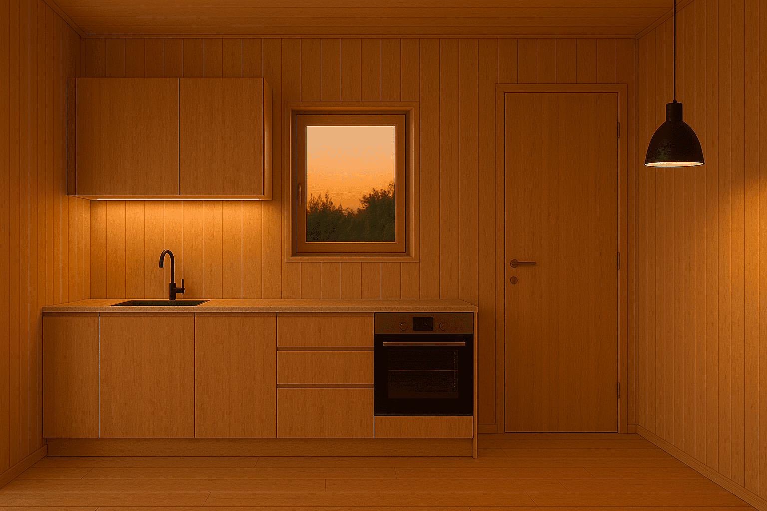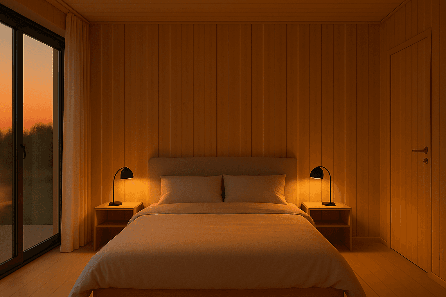 Inside the 969 sq ft layout, every element serves a purpose. Two intimate bedrooms nestle beneath the eaves, while the open living space feels expansive thanks to the soaring ceiling and full-height windows. Wooden interiors and soft lighting create an atmosphere of comfort and calm, perfect for snowy nights or sunny lake weekends.